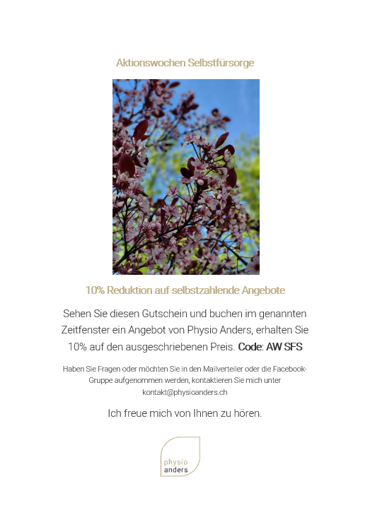 Wenn Sie sich etwas für Körper, Geist und Seele gönnen möchten, Interesse an Gruppenangeboten haben oder wer in den Mailverteiler vom Newsletter aufgenommen werden möchte, soll sich gerne bei mir direkt melden.